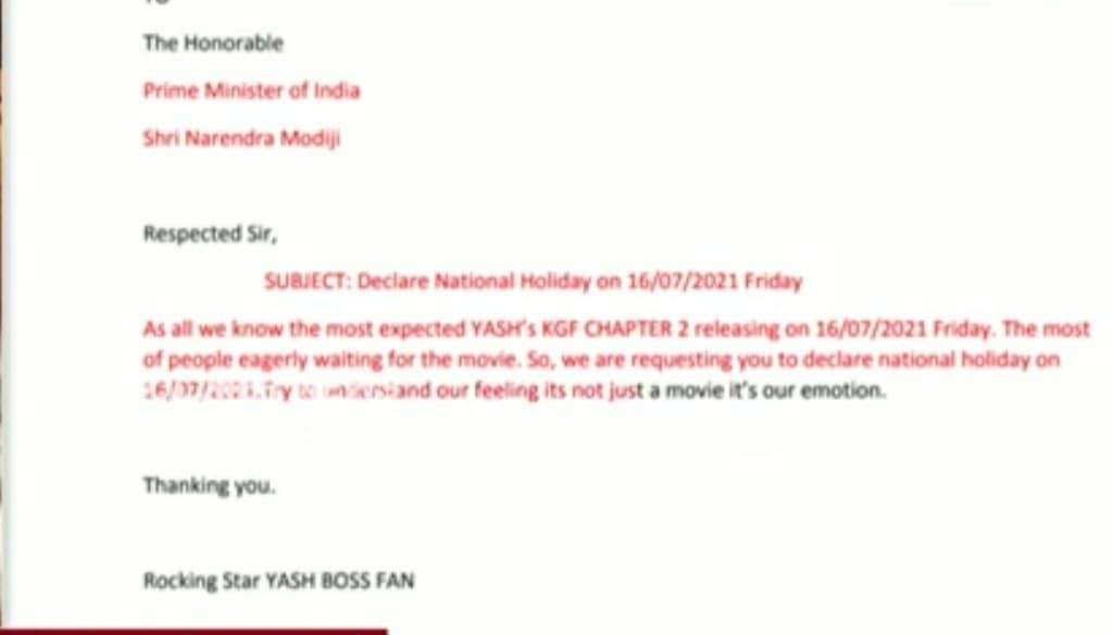 ஜூலை 16,2021 அன்று வெளியாக இருக்கும் திரைப்படம் கே.ஜி.எஃப் 2. மிகுந்த எதிர்பார்ப்புடன் மக்கள் இருக்கும் இந்தத் திரைப்படத்தைக் காண அந்த திரைப்படக் கதாநாயகரான யஷ் ன் ரசிகர்கள் பிரதமர் நரேந்திர மோடிக்கு கடிதம் ஒன்றை எழுதியுள்ளனர்.