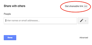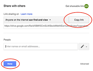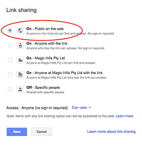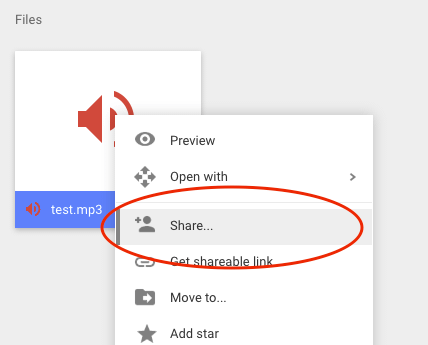 How to Get Google Drive Sharing URL 1. Upload your audio/video file to Google Drive, then right click on the media file in Google Drive and select the menu item Share 2. Click the Get Sharable link 3. Click the “can view” arrow then select More from the drop down list 4. Select On – Public on the web 5. Click the button Copy Link, then click Done. The copied link is the Google Drive sharing URL of the file. 6. Use the Google Drive direct link generator tool to convert the URL to Google Drive Direct